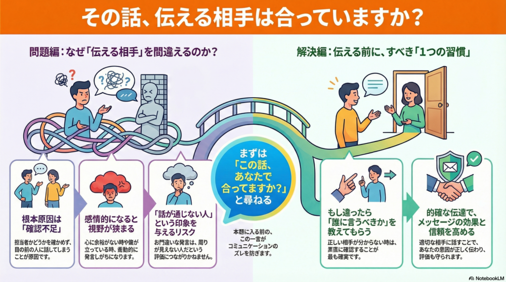 伝える相手を見定めることは自分の主張を正しく理解してもらうための第一歩です。 疑問に感じたら一度立ち止まり、相手に確認する癖をつけましょう。コミュニケーションを円滑にする鍵は勢いで言葉を放つことではなく届ける相手を間違えないことにあります。