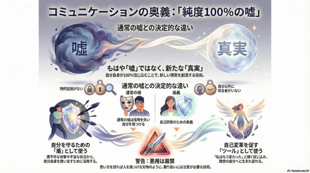 コミュニケーションにおける嘘とは、単に人を欺く手段ではなく自分を守り自己を変革するための奥義です。はいちょっと意味が分かりませんよね。