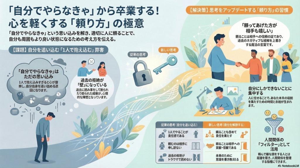 「自分でやらなきゃ」という気持ちは一見すると強い責任感の表れであり素晴らしいものに思えます。実はこれ、単なる思い込みです。