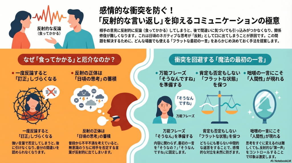 • 考える時間が稼げる: 最初の一言を固定することでその間に相手の話を咀嚼して次の言葉を冷静に選ぶ余裕が生まれます。